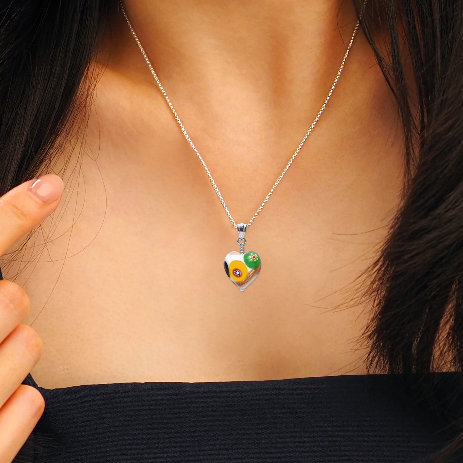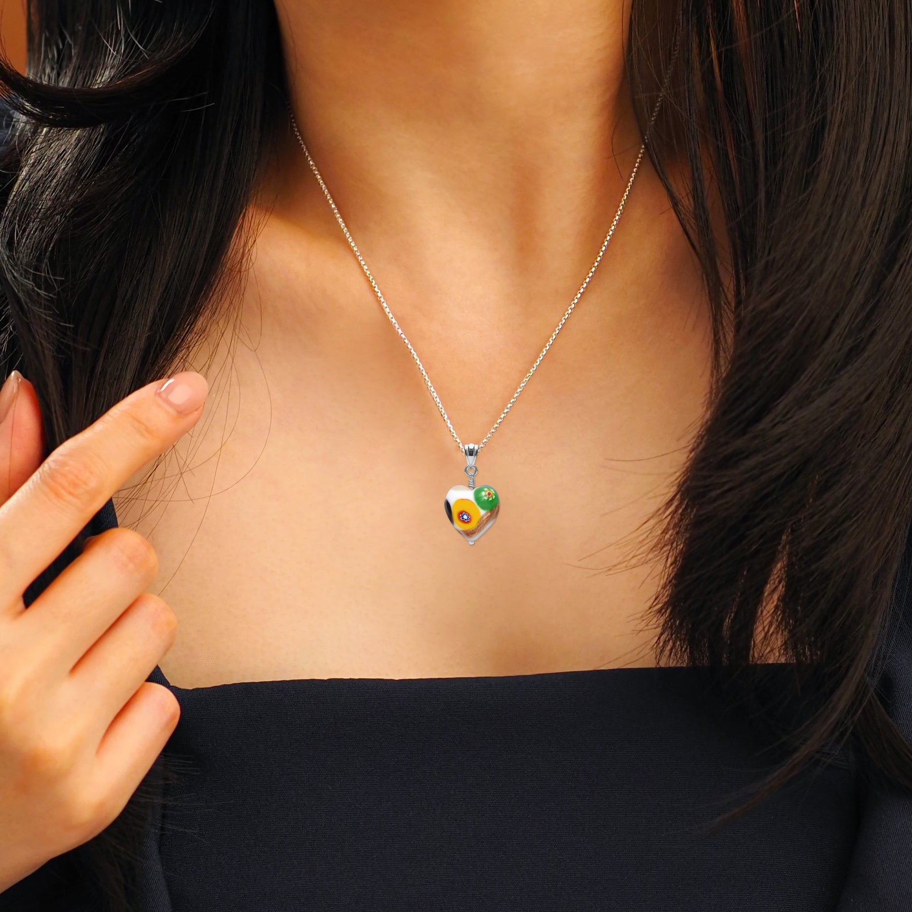Artylish 灑金白色心形吊墜頸鏈是優雅與藝術的完美結合,以獨特的設計和意大利工藝打造出令人驚艷的時尚配飾。吊墜採用純白色背景,搭配閃耀的灑金玻璃,營造出迷人的3D立體心形效果,讓每一個角度都散發出奪目的光芒。