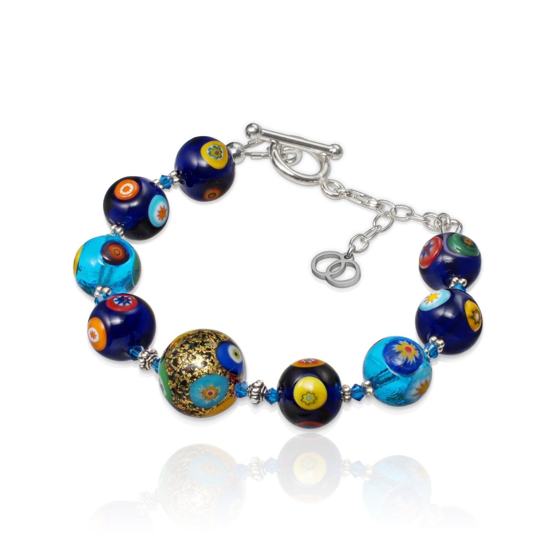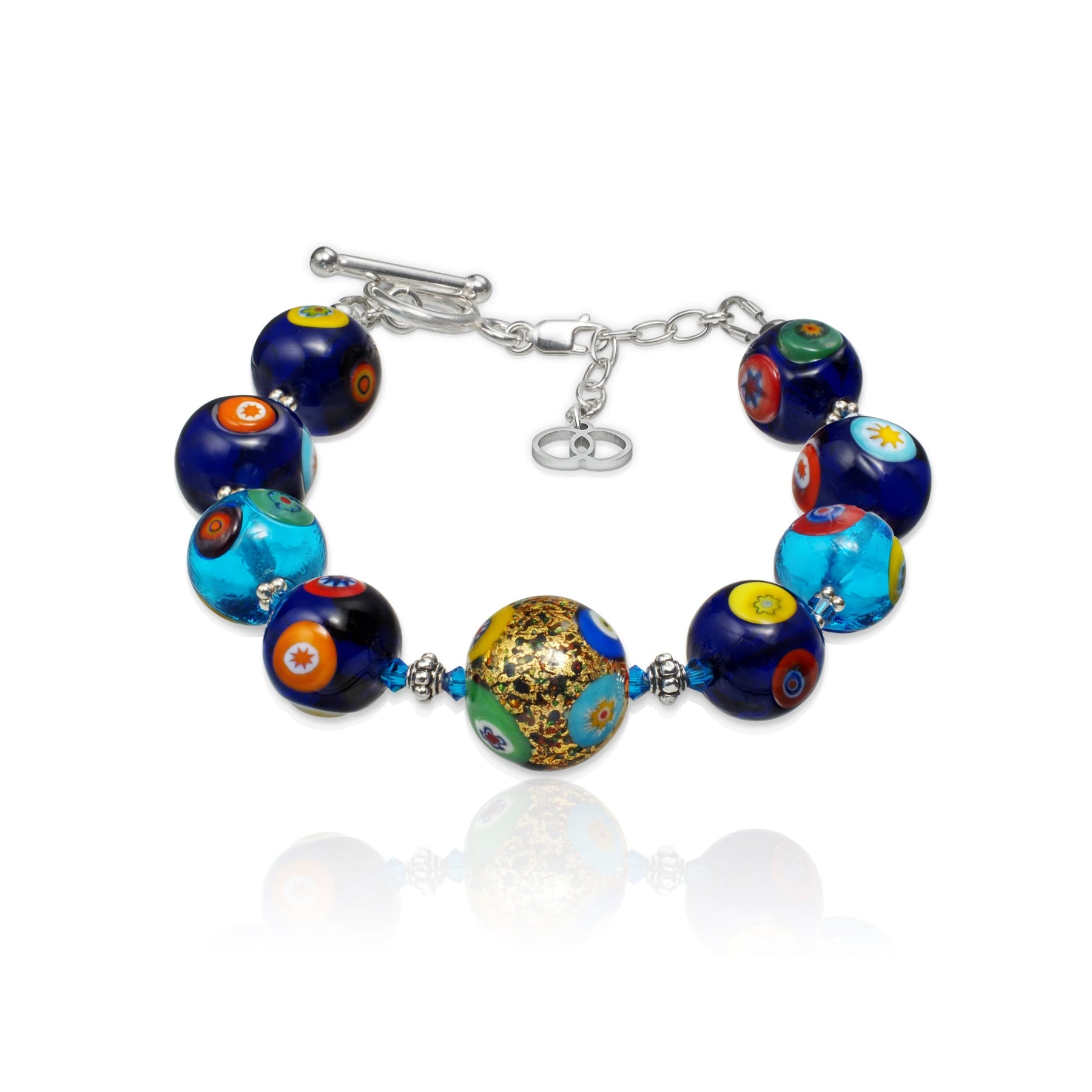 這款手鏈以型格的藍色調為主,搭配閃耀的金箔元素,由千花藝術琉璃圓珠構成,每顆小珠都由意大利工匠全手工製作,將不同的千花玻璃小顆粒熔融於圓珠之上,中央的24K金箔琉璃成為焦點,兩側搭配半透明鈷藍與泉水藍的圓珠,展現清新與高貴的獨特格調,讓佩戴者無時無刻散發迷人魅力。