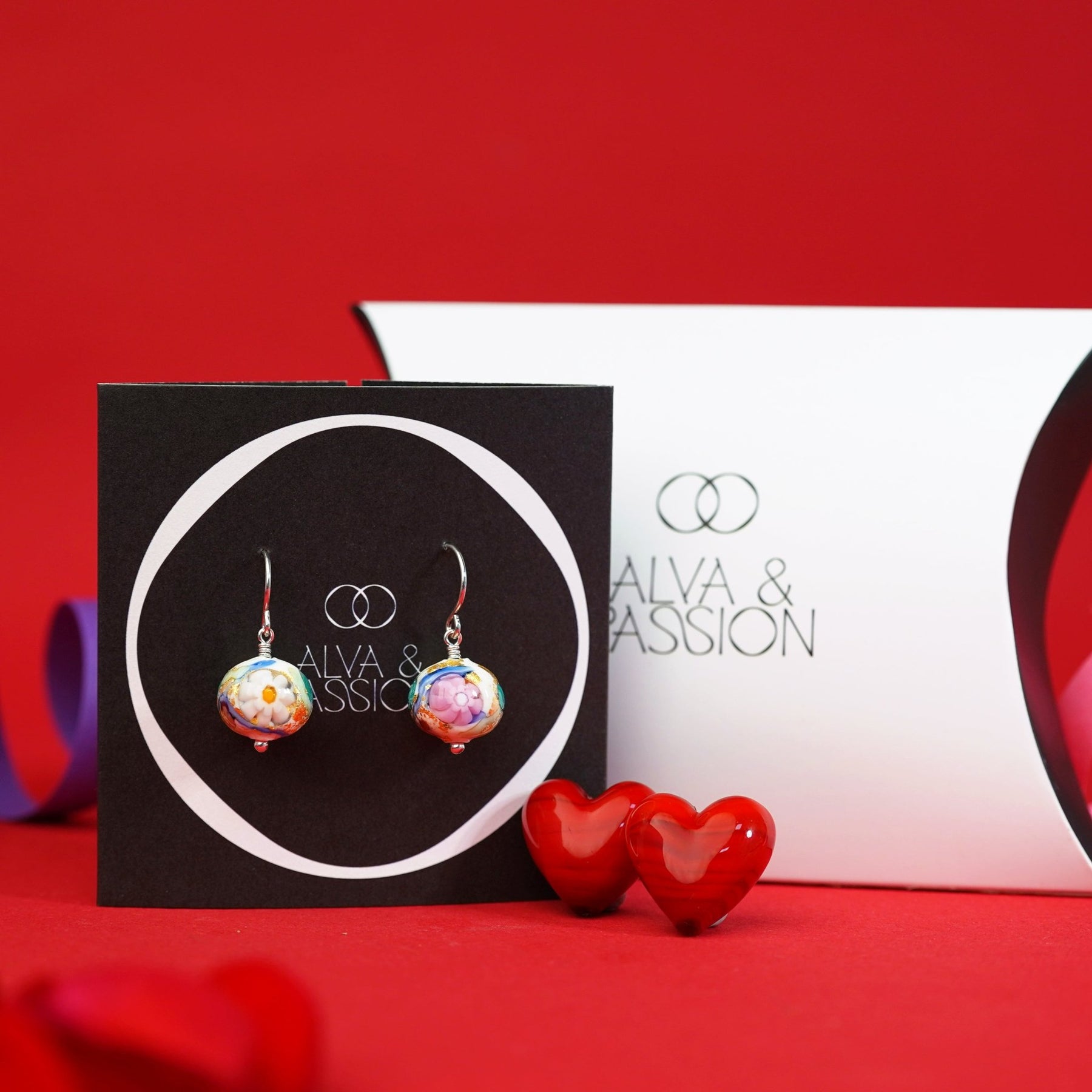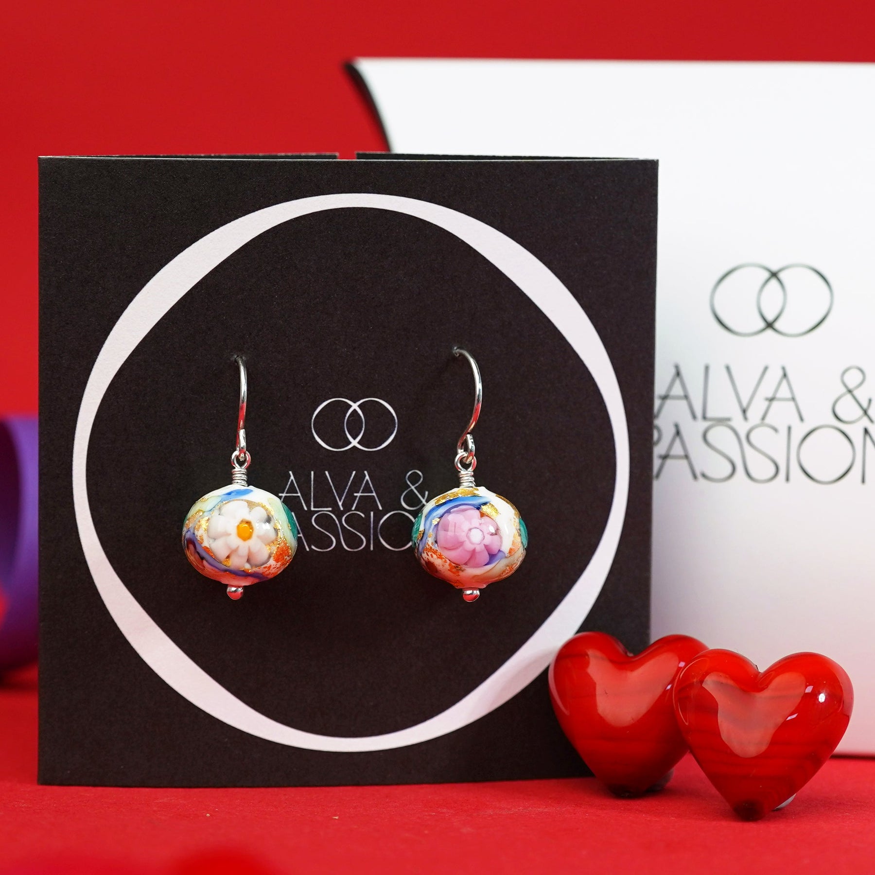 耳環由意大利匠人運用精湛的琉璃燒製工藝打造,將盛放的精緻花朵巧妙融入圓形設計中,並以24K金箔點綴,使整體層次感更加豐富,充滿高貴氣息。經過多層保護塗層處理,確保耳環色澤持久亮麗,讓這件迷人的藝術品伴您長久。
