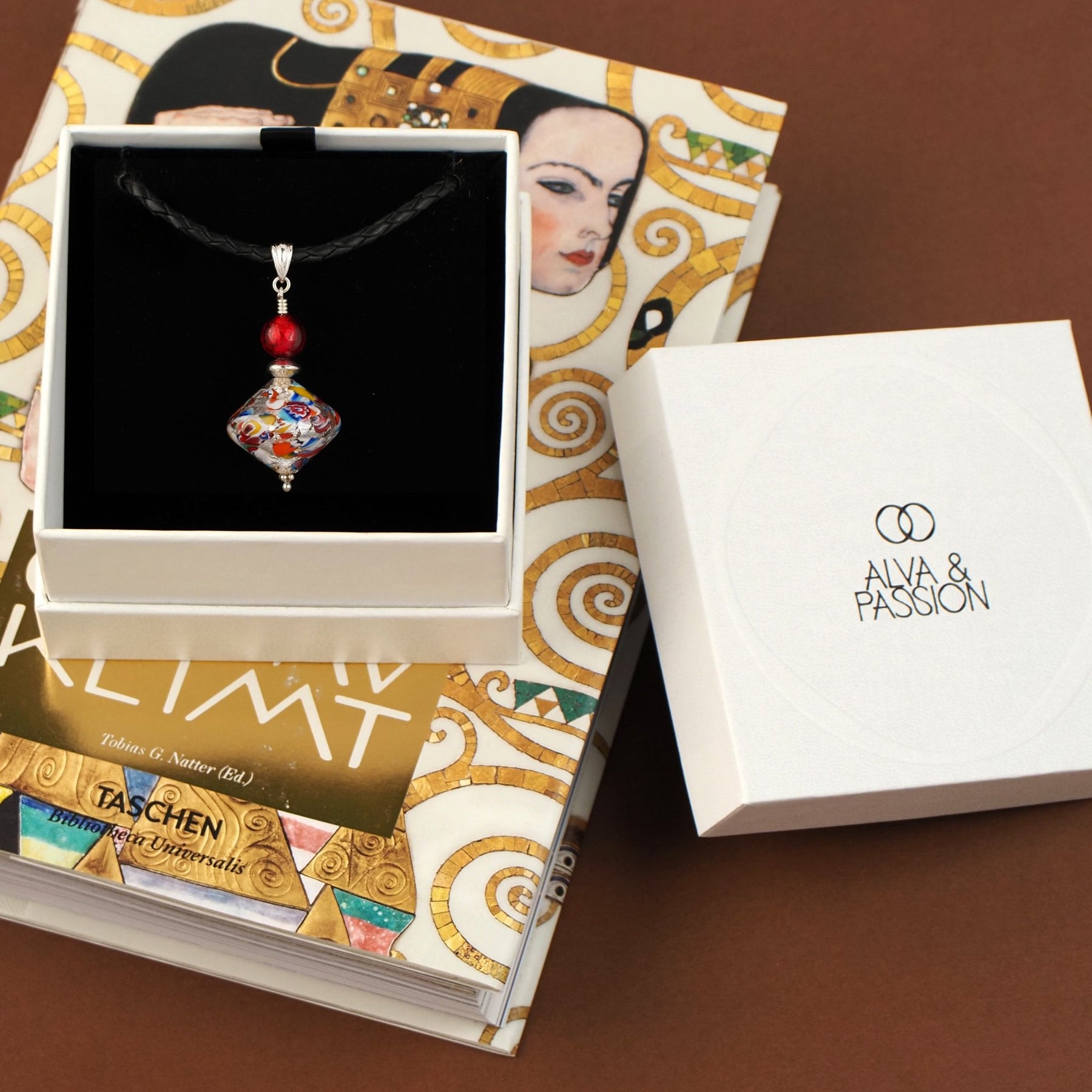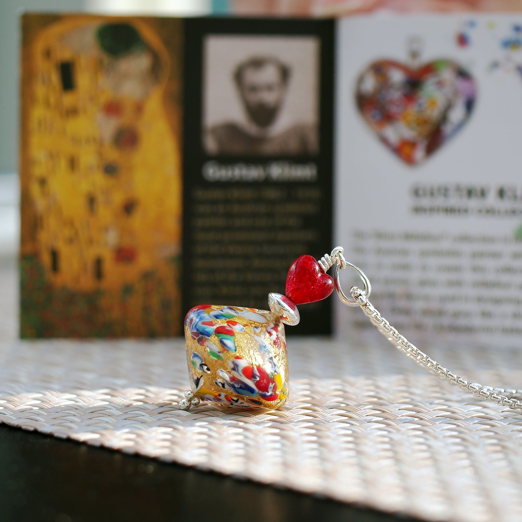 每件琉璃藝術品由意大利工匠全手工打造,將的千花琉璃完成品壓碎成色彩繽紛的碎片,再巧妙地把千花碎片 與 24K金箔或銀箔完美融合而成,締造出充滿畫作《The Kiss》風格的色彩元素